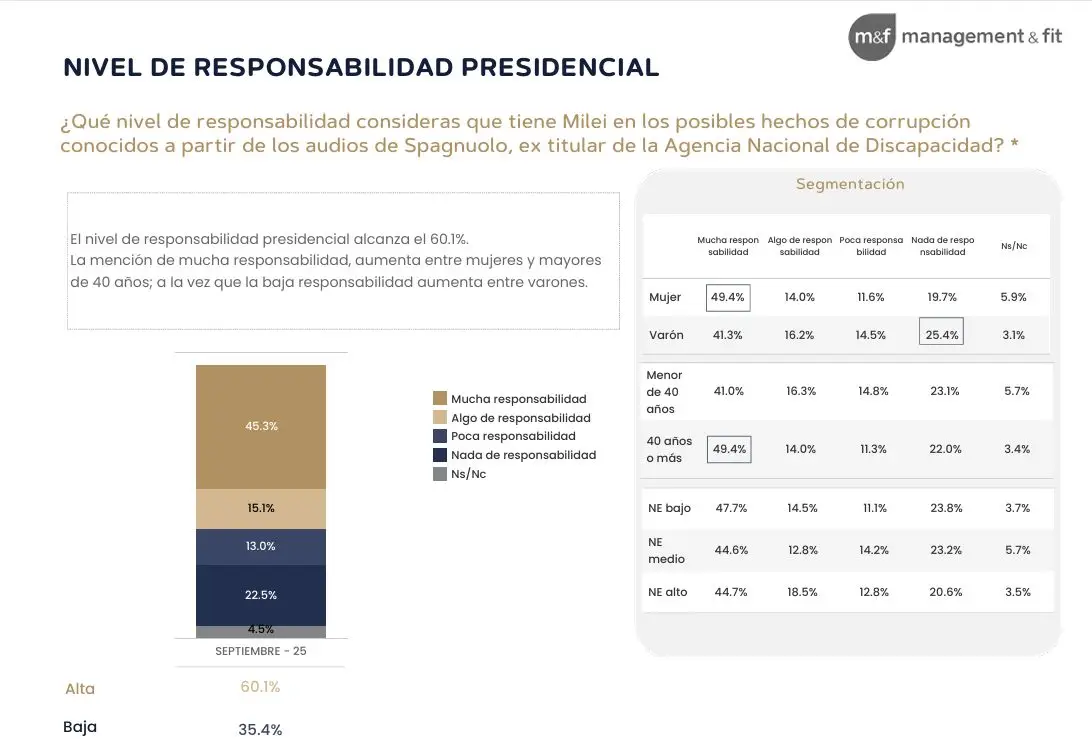 En la encuesta de Haime, casi un 70% de los consultados dijo que sus ingresos no le alcanzaban a cubrir los gastos (31%) o que apenas los cubrían (38%). En el caso de Management & Fit, las dificultades para cubrir los gastos subieron un 3,7% respecto a agosto. «Uno de cada dos no llega a fin de mes y ocho de cada diez cambiaron los hábitos de consumo», señaló Lara Goyburu, directora de M&F en Futurock. Agregó que esta preocupación era mucho más alta entre los mayores de 40 años, que en mayoría ya tienen gastos familiares que mantener, a diferencia de los más jóvenes que no tienen esa preocupación. Otro dato que se modifica mes a mes es que, como es lógico, cada vez son más quienes responsabilizan a Milei de la situación económica (60%) que al ya más lejano gobierno de Alberto Fernández.