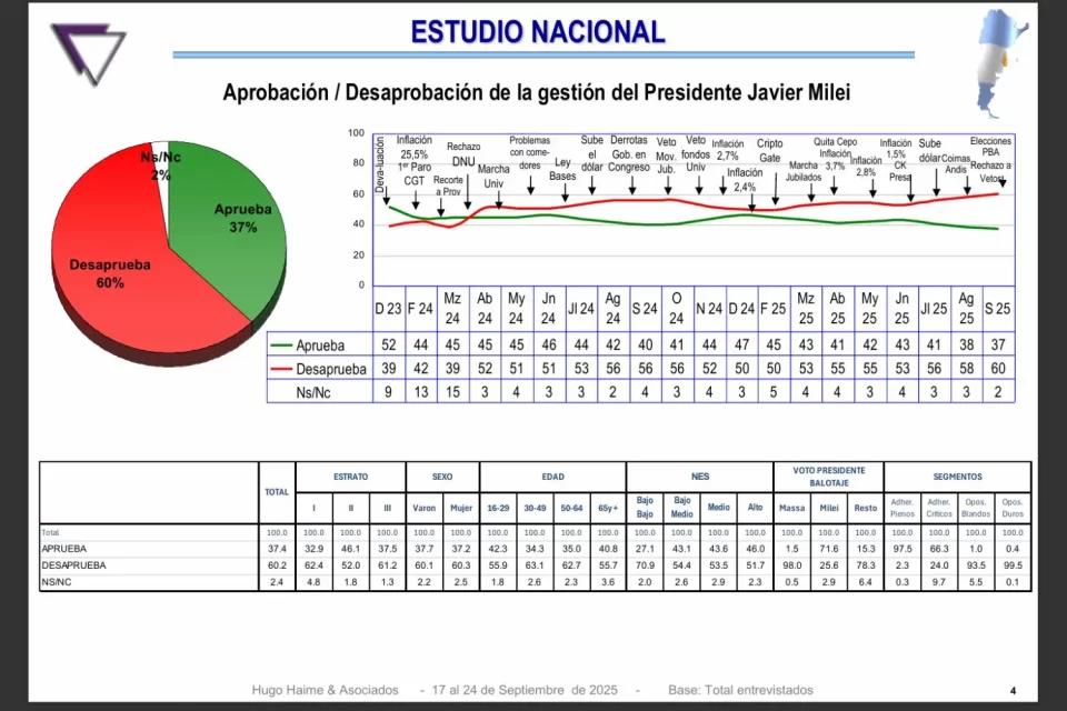 Los sondeos concluidos en septiembre mostraron una nueva caída de Milei en términos de imagen y de gestión. Si bien planteaban un escenario de paridad en voto a nivel nacional, el caso Espert cambiaría la tendencia en PBA.