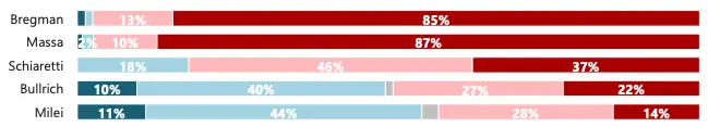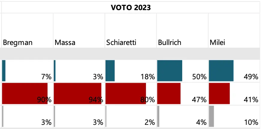 Algo parecido ocurre cuando el mismo estudio consulta por la aprobación de la gestión presidencial y desagrega los resultados según el voto en primera vuelta de 2023. Previsiblemente los votantes opositores muestran fuerte negatividad, pero los votantes oficialistas también tienen niveles altos de respuestas negativas. El 49% de los votantes de Bullrich tiene una evaluación mala o muy mala de la gestión de Milei. Y 42% de los votantes de Milei también.