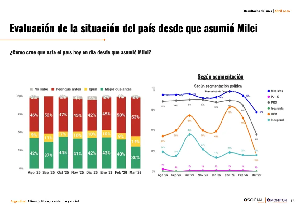 Tras varios meses de caída del Gobierno en las encuestas y a un año del inicio de la campaña electoral, el escenario parece haberse estabilizado en algunas certezas transitorias: una gran porción del electorado no polarizado («blando») está sufriendo la situación económica, abandonó a La Libertad Avanza y busca otras opciones. El presidente Javier Milei conserva el respaldo de su núcleo duro, estabilizado en un cuarto del electorado; mientras crece el voto duro opositor, que todavía no encuentra un canal único de expresión de cara a 2027.