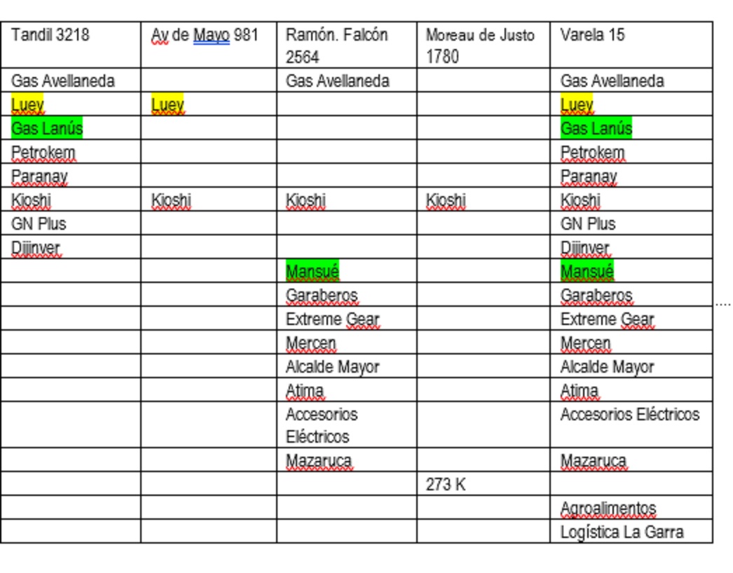 A lo largo de los años han tenido cinco domicilios distintos. El cuadro que sigue muestra cuántas empresas hubo en cada una de esas direcciones. Marcada en amarillo la que comparten Bonadío y los Moreno. En verde las de Bonadío, entre cuyos socios figuran Fernando Luis y Alejandro Vicente Climent. El resto, de los Moreno, con distintos socios en cada una.