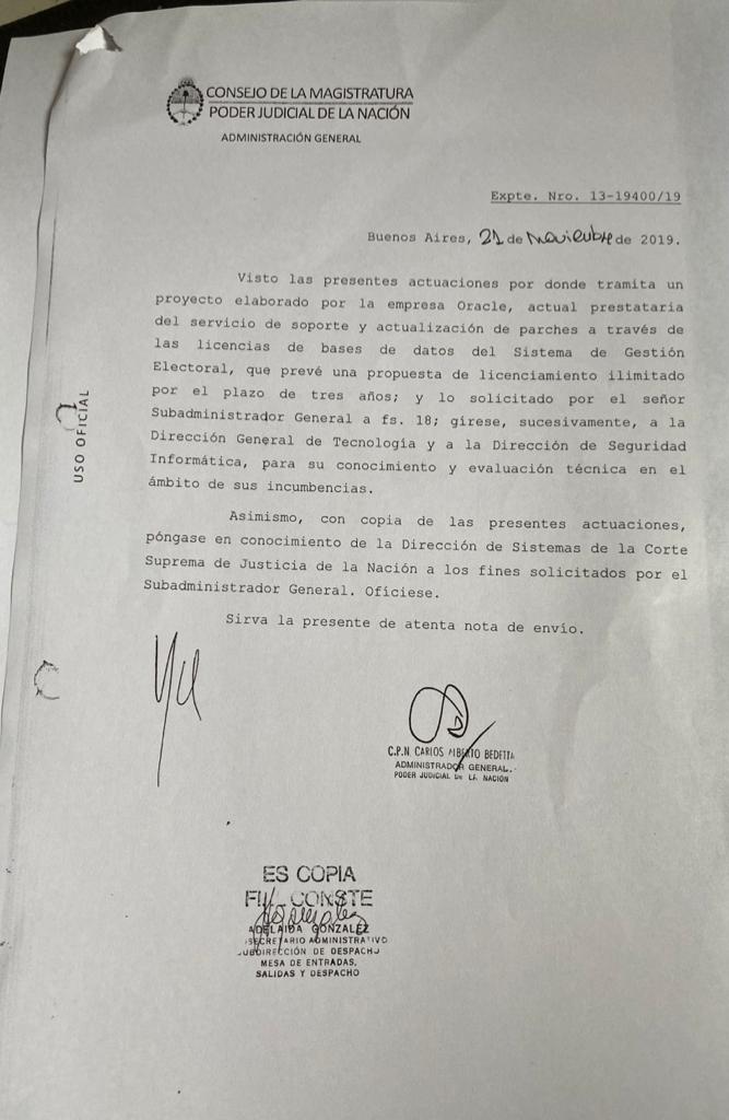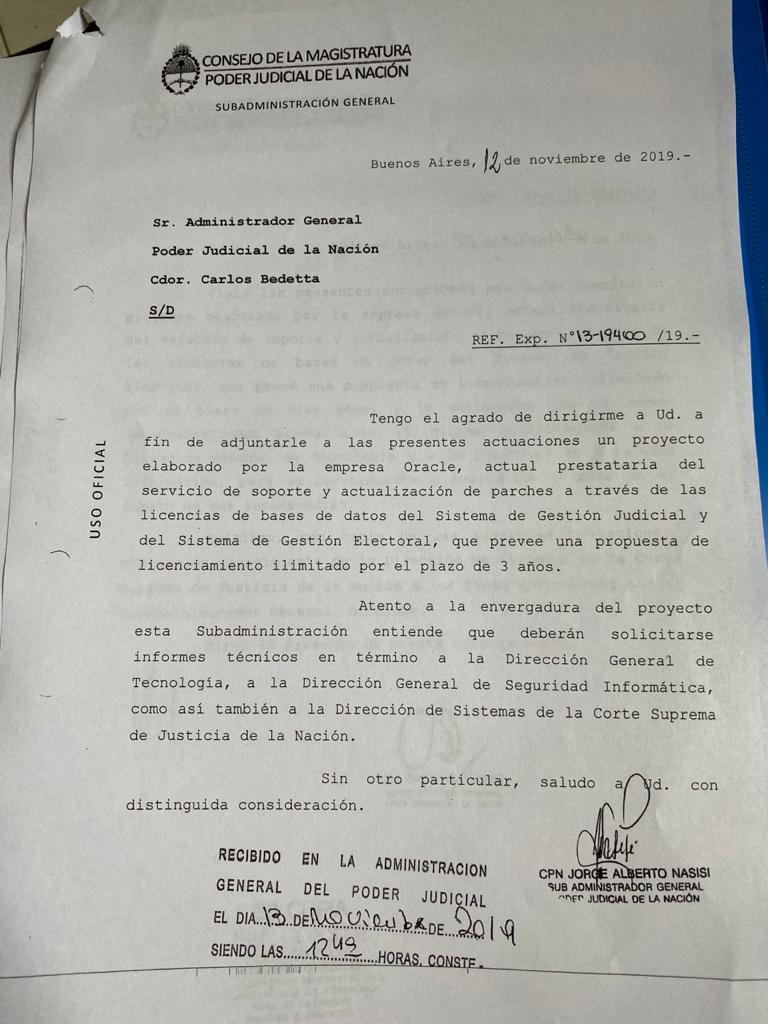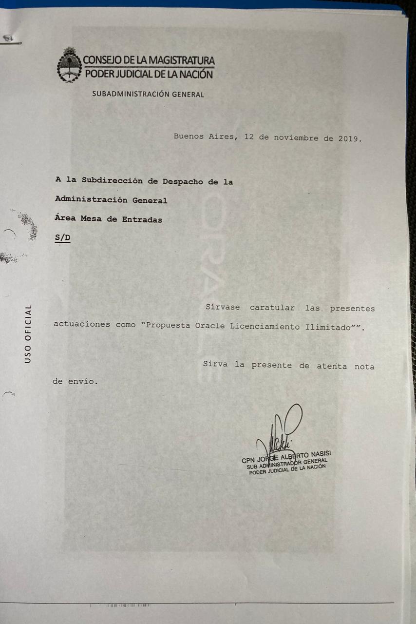 Un dato fundamental es que la oferta de Oracle fue presentada a principios de noviembre de 2019, cuando aún gobernaba el presidente que designó a Rosenkrantz como su delegado en la República Autónoma del Cuarto Piso. Y el apagón informático se produjo en enero de este año, dando el pie para que Rosenkrantz llevara la propuesta formal de la compañía al Acuerdo de la Corte Suprema.