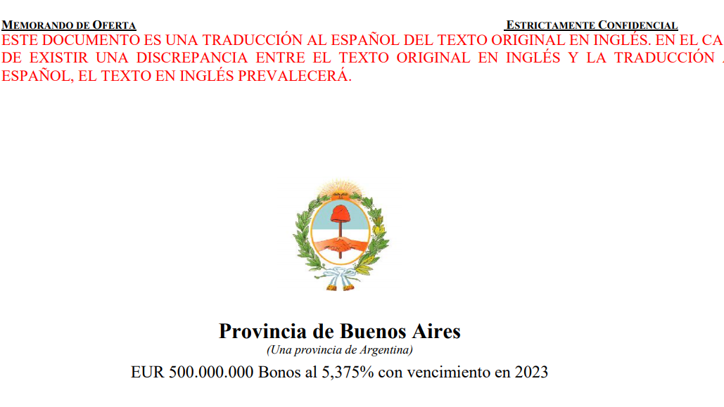 En el memorando de oferta de los bonos que colocó en 2017 por 500 millones de euros y con vencimiento 2023, Vidal les alertó a los potenciales acreedores que “la actual administración (NdR: en referencia a Macri) realizó cambios significativos en las políticas económicas y anunció medidas adicionales, y el fracaso o la falta de implementación de estas medidas adicionales podría impactar en la economía de Argentina y de las provincias y en el mercado de títulos de deuda”.