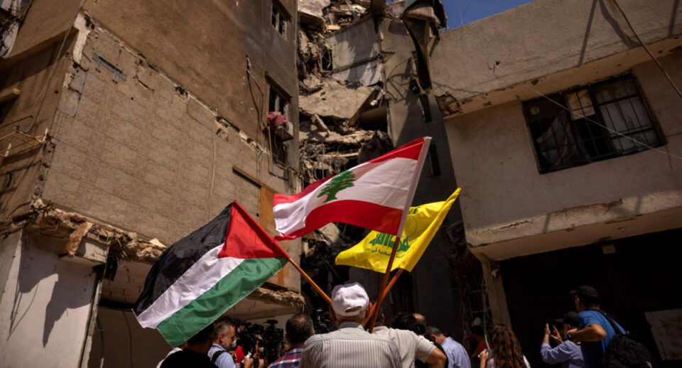 Las banderas de Palestina, Líbano y Hezbollah. Foto: Reuters.