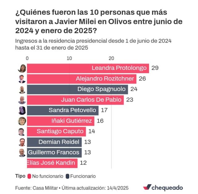 Según los registros públicos, entre quienes más acuden a la residencia se destacan la kinesióloga Leandra Protolongo, el filósofo Alejandro Rozitchner, el economista Juan Carlos De Pablo y el ex abogado de Milei y funcionario, Diego Spagnuolo.