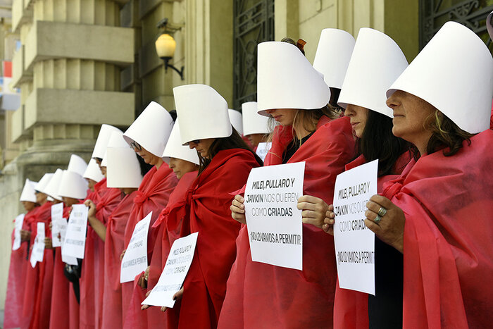 «Milei, Pullaro y Javkin nos quieren como criadas. No lo vamos a permitir», decían los carteles que llevaban las manifestantes, con túnicas rojas y cofias.