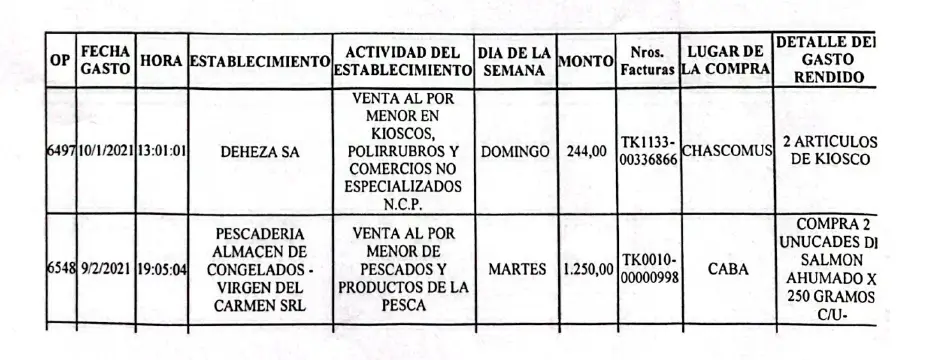 En la auditoría, tras los respectivos análisis realizados, señalan que identificaron reintegros en el marco de «gastos de representación» por alimentos que fueron adquiridos en supermercados, carnicerías, pescaderías, casas de pastas y entregas a domicilio, algunos de ellos llevados a cabo en Mar del Plata. «Se observa el reintegro de gastos en productos alimenticios que no cumplirían con la función de representar la empresa fuera de sus oficinas o mejorar su posición en el mercado«, según la definición mencionada anteriormente, indicaron.