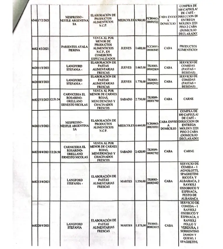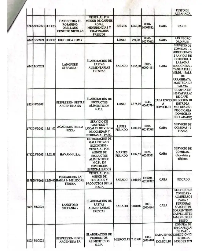 Entre los gastos destacados señalan: locales de venta al paso por la compra de fiambres, carne, pastas frescas, pescado, chocolates y helados; gastos por la compra de cápsulas de café de la marca Nespresso donde se indica como dirección de entrega su domicilio; gastos realizados en días y horarios no laborales o feriados en la Costa Atlántica y otros gastos realizados en días y horarios laborales.