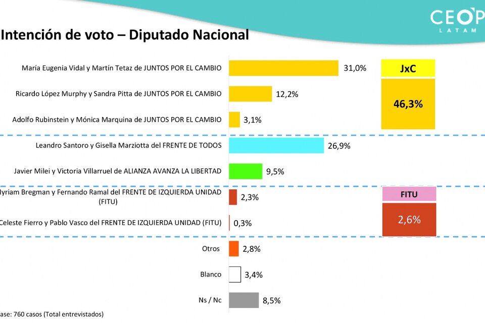 Las conclusiones surgen de una encuesta realizada por el Centro de Estudios de Opinión Pública (CEOP), que lidera el sociólogo Roberto Bacman. En total se entrevistaron 750 personas a través de una selección on-line al azar, pero completando cuotas por edad, sexo y nivel económico-social proporcionales a la población El trabajó se terminó este mismo viernes. Según ese sondeo, Juntos sacaría en la Ciudad de Buenos Aires un 46,3 por ciento, el Frente de Todos el 26,9 y Milei el 9,5.