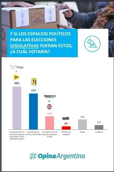 En cambio, en un escenario de alianza entre mileismo y macrismo, el binomio empata con el peronismo en 29%. Es decir, se quedan cuatro puntos en el camino.