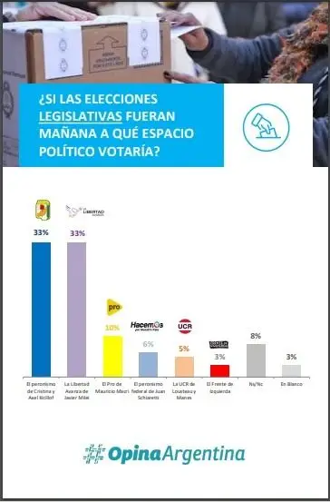 También, la consultora planteó a qué espacio votarían los consultados si las elecciones legislativas se realizaran mañana. En un primer escenario, el peronismo saca un 33%, empatando con LLA.