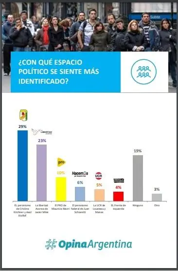 En ese contexto, la opción más votada es «el peronismo de (la ex presidenta) Cristina Kirchner y (el gobernador bonaerense) Axel Kicillof» con un 29%, seguido de «LLA de Milei» con un 23%. «El PRO de Macri» obtiene un 10% y queda detrás de la categoría «ninguno» que asciende a un 19%.