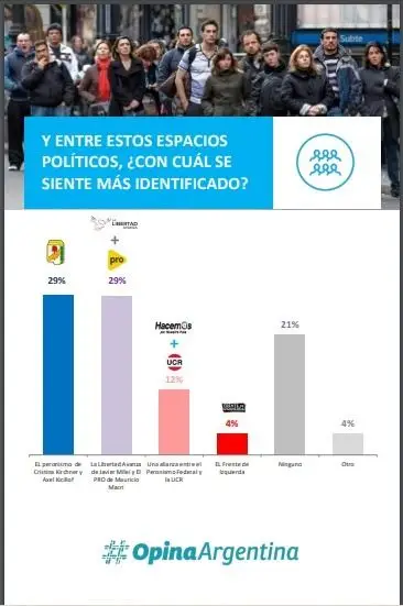 La consultora Opina Argentina realizó un trabajo a nivel nacional en el mes de octubre, en el que preguntó, en primera instancia sobre cuál es el espacio con el que el electorado se siente más identificado. En un primer escenario, puso a LLA y el PRO por separado.