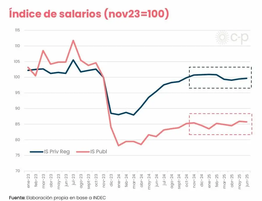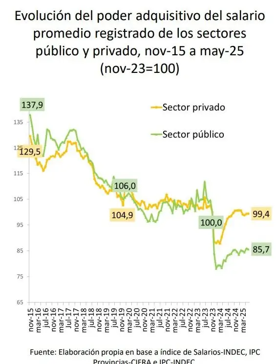 Ante las críticas que se han hecho sobre el IPC-Indec por su falta de actualización y por no reflejar los nuevos precios relativos, Cifra-CTA realizó un ejercicio con un “IPC reponderado”. Con este índice, la pérdida de poder adquisitivo entre noviembre de 2023 y junio de 2025 alcanza un 9,1%. En una comparación de mediano plazo, el salario registrado privado resulta 23,3% inferior al de noviembre de 2015, mientras que el salario del sector público es 37,9% más bajo que en ese mismo mes.