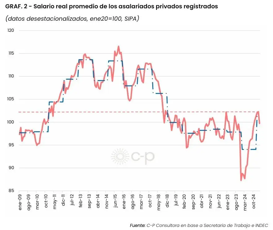 Pastrana y Moldovan explican que, aún con una base de comparación muy baja (mayo 2024), se registró una contracción del empleo en los datos interanuales de 2,6%. La variación de apenas 0,3% en los asalariados privados muestra las dificultades del modelo para generar empleo registrado, es decir, su tendencia es de estancamiento.