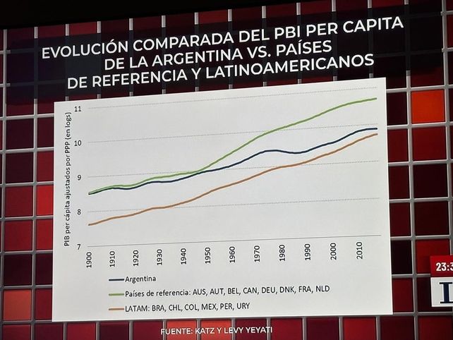 Este lunes en Odisea Argentina, programa de LN+, participó la historiadora rosarina Camila Perochena junto a su colega Roy Hora. Allí se abordaron una serie de interrogantes de la historia argentina, específicamente, las distintas versiones sobre el «fracaso argentino». En este sentido, los investigadores compartieron un cuadro donde se podía observar el desarrollo del PBI de Argentina entre 1900 y 2010 y la comparación con los países europeos y latinoamericanos.