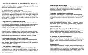 Las fechas de las principales resoluciones se fijaron con el calendario electoral. Ahora, con un mes de anticipación fijaron la lectura de la condena para el 13 de noviembre, «cuatro días antes de la fecha que estaba prevista para la elección de autoridades del Partido Justicialista». El verdadero objetivo, añade, es «mi inhabilitación para desempeñar cargos públicos a perpetuidad. O sea: lisa y llanamente proscripción de por vida. Una vez más el peronismo y la proscripción. Nada nuevo bajo el sol». En esta misma edición podés leer completa esa declaración de la ex Presidenta. Al día siguiente de la condena, Cristina difundió un análisis del fallo realizado por la Inteligencia Artificial de Chat GPT. Es impactante su señalamiento del uso de pruebas indirectas e inferencias, la incorporación contradictoria de pruebas y hechos de otras causas, el uso de conceptos políticos como base jurídica, la cronología incoherente, la falta de análisis del riesgo jurídico, la confusión territorial y temporal de reuniones, la inexistencia de pruebas sobre un beneficio personal, la vulneración del principio de congruencia, todo lo cual vulnera principios fundamentales del derecho penal, como la congruencia, la presunción de inocencia y el debido proceso.