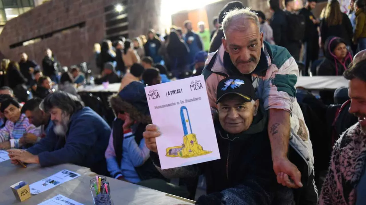 Este miércoles, una gran mesa solidaria reunió a personas en situación de calle, en la explanada de la Casa Pastoral de la Catedral, a pasos de Monumento Nacional a la Bandera.