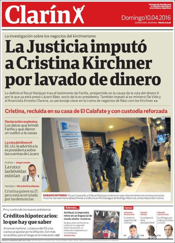 La detención se produjo en el momento adecuado. Corrió de la agenda el estallido de los Panamá Papers: la investigación del Consorcio Internacional de Periodistas se había publicado el 4 de abril, sólo un día antes. Mauricio Macri aparecía entre los cinco mandatarios en ejercicio que integraban sociedades offshore en 21 paraísos fiscales. Inmediatamente, en la causa pasó de todo. Leonardo Fariña declaró como arrepentido coucheado por el gobierno, según reveló su abogada más tarde. Dio datos de cuevas financieras. Pero también llevó papeles escritos, con anotaciones subrayadas. Un dato en el que el juez reparó y dejó por escrito. Ante esos papeles, Fariña de pronto habló de un plan sistemático de corrupción por fuera del eje de la causa de lavado. La idea del plan no prosperó, pero a él le permitió introducir el nombre de Cristina Fernández. Y al fiscal Guillermo Marijuan que oía atentamente le permitió escribir una imputación. Al día siguiente, Clarín llevaba a tapa el nombre de la entonces ex Presidenta con letras de molde. Todo pasó en sólo cinco días.