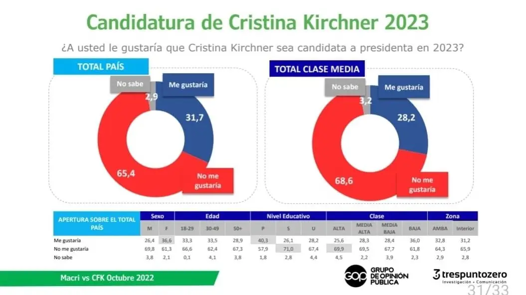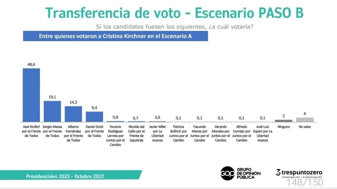 En el mismo trabajo, la intención de voto de la vicepresidenta fue del 31,7% en todo el país. El piso alto y techo bajo en los apoyos a Cristina es una característica que viene de larga data, pero no hay postulante del oficialismo que escape a esa situación. Se podría pensar que Alberto o Massa mejorarán sus posibilidades en la medida que se encarrile la situación económica en los próximos meses, pero en ese caso es probable que también Cristina recupere algunos puntos. Los dirigentes del kirchnerismo sostienen que deben tratar de recuperar en la memoria colectiva el nivel de vida que tuvieron durante la mayor parte de los mandatos de la ex presidenta para que esos índices de imagen negativa desciendan. Por otro lado, no se ve sencillo quién podría mantener el caudal de votos de CFK en caso de que no se postulara. En el sondeo, Kicillof se posicionó como el principal receptor de esas adhesiones, pero el gobernador ya dejó en claro que su objetivo es ser reelecto en la Provincia.