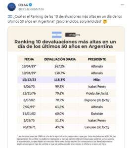 La devaluación anunciada por Caputo es la tercera más grande en un solo día, sólo por detrás de las dos de Alfonsín en 1989, pero por delante incluso de la más célebre, el Rodrigazo de 1975. Hasta las dictaduras de los generales Alejandro Lanusse, Benito Bignone y Jorge Videla quedan relegadas en esta lista de horrores económicos compilada por la CELAG.
