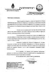 El 17 de mayo de 2019, el director de la Agencia Federal de Inteligencia, Gustavo Arribas, encomendó a su director legal y técnico que protestara ante el Ministerio de Defensa. Según Arribas, ese informe fue realizado por «un órgano que no pertenece al Sistema de Inteligencia Nacional SIN y por lo tanto incompetente, contrariando normas federales vigentes». Las Fuerzas Armadas no tienen permitido realizar