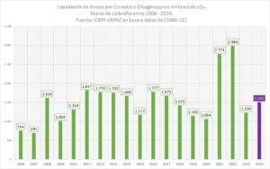 Una fantasía recurrente es que estos gestos de obsecuencia hacia Washington serán retribuidos con su apoyo en el FMI, algo que hasta ahora no ha ocurrido. El viaje del ministro de Economía Luis Caputo a Estados Unidos en los próximos días repetirá el intento de obtener nuevo endeudamiento por otros 15.000 millones de dólares. El Fondo es pródigo en lisonjas verbales para el «impresionante ajuste» que está haciendo Milei, pero no depone sus críticas a la falta de sustento político de medidas que se adoptan por decreto y sus temores por la reacción social que provocarán cuando se sientan en toda su extensión y profundidad. La única noticia alentadora para el gobierno en su avidez por conseguir dólares es el incremento en la liquidación de divisas por la exportación de cereales y oleaginosas, superior a la del año pasado, si bien aún lejos de las de 2021 y 2022. Aunque no dejan de presionar por una nueva devaluación o una mejora en el mix cambiario al que se transan las operaciones, han comenzado a liquidar la cosecha gruesa.