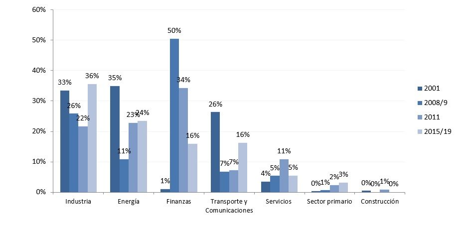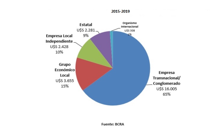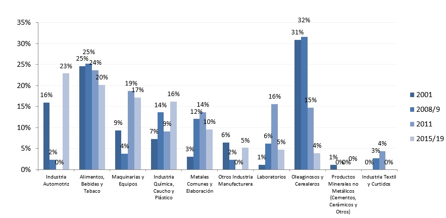 En el gráfico que muestra la apertura en ramas industriales sobresale el sector automotor, con gran participación en la demanda de dólares en 2001 (16%) y una especial participación en el macrismo (con 23% es el sector industrial de mayor fuga en el periodo), con empresas como Toyota, FIAT y Volkswagen. El sector de Alimentos y Bebidas tiene entre el 20% y el 25% de la demanda de dólares del Top 100 en los cuatro periodos (25% en 2001, mismo porcentaje en 2008-2009, 24% en 2011 y 20% en el macrismo), con empresas repetidas en más de un periodo, como Arcor, Quilmes, Coca, Cola, Bagley o Fratelli Branca Hnos. También la industria química refleja una participación sostenida en el tiempo en la demanda de dólares: 7%, 14%, 9% y 19% respectivamente, protagonizada por empresas como Dow Chemical o PBBPolisur. El sector oleaginoso y cerealero –con gran participación de empresas aceiteras exportadoras— realizó una muy elevada demanda de dólares en 2001 (31%) y 2008/2009 (32%); descendió a 4% en 2011 y apenas al 1,4% en el cuatrienio macrista.