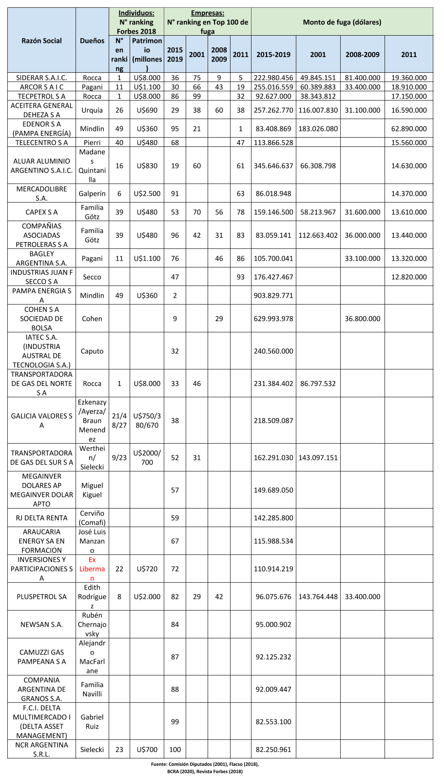 Otro corte significativo se obtiene agrupando en un cuadro a los Grupos Económicos Locales que figuran en el reciente informe del Banco Central y cotejar los datos de sus principales accionistas con los de la lista de las grandes fortunas argentas publicada por la revista Forbes. Ese ranking fue encabezado por Paolo Rocca, con un patrimonio personal valuado en U$S 8.000 millones en 2018. Tres de sus empresas: Siderar, Tecpetrol y Transportadora de Gas del Norte fugaron más de U$S 500 millones entre 2015-2019, repitiendo, aunque en mayor cuantía, lo realizado en 2001 y 2008/9. Le siguen, en el ranking de patrimonio personal de Forbes, Marcos Galperín de Mercado libre, Edith Rodriguez propietaria de Pluspetrol, Luis Pagani con Arcor y Bagley y Madanes Quintanilla con la propiedad de Aluar.