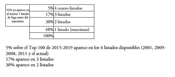 Para elaborar este cuadro colocamos las empresas del Top 100 2015-2019 que aparecen en al menos en uno de los tres listados. Esto permite sacar una primera gran conclusión: de las 100 empresas que más fugaron durante el macrismo, el 52% ya lo había hecho al menos una vez anteriormente, según este detalle: