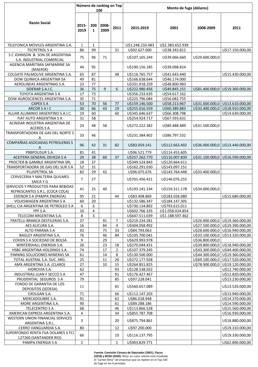 El cartón lleno para los cuatro períodos se cumple en casos paradigmáticos como Aceitera General Deheza, Arcor, Siderar, CAPEX y Compañías Asociadas Petroleras S.A, que están marcadas en celeste en el cuadro. Vale aclarar que en este cruce se consideró sólo a las empresas que figuran entre las primeras 100, sin considerar si hay repeticiones de razones sociales en listados de fuga más amplios que el Top 100 (lo que es altamente probable).