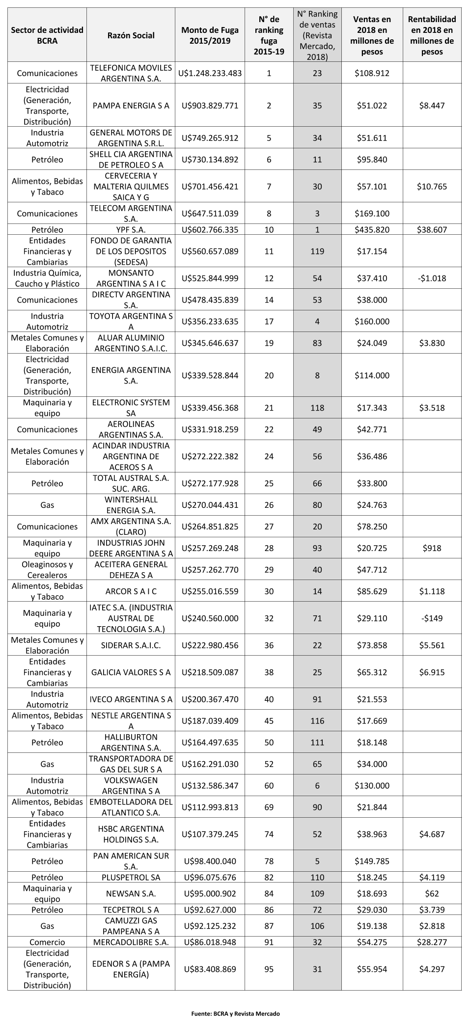 Otro cotejo útil es el de la fuga durante el cuatrienio macrista, con la facturación y la rentabilidad del Top 100 en el año 2018, según los datos de la revista Mercado. Si bien no hay información disponible para toda la lista, alcanza para constatar que la mayoría de las firmas que protagonizan a fuga en el macrismo forman parte de la cúpula de las 120 de mayores ventas en el mismo periodo (tomando solo el año 2018).