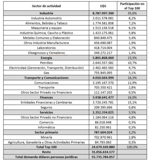 Si la lista se reordena por sector de actividad, entre industria y energía explican más de la mitad del Top 100 de la fuga, y dentro de la industria prevalece la automotriz.