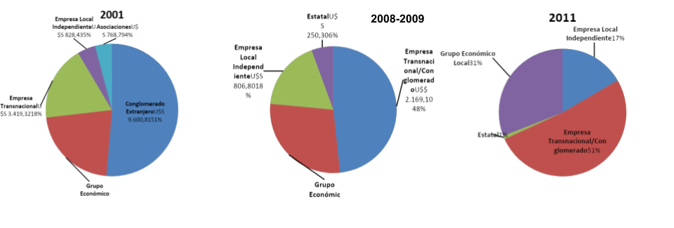 Si se clasifican y agrupan las empresas por el origen del capital, se mantiene a lo largo de las dos décadas del siglo el predominio de las extranjeras. En 2001, 2008/2009 y 2011 explicaron la mitad de la fuga, pero fue muy apreciable el salto durante el macrismo, cuando representaron los dos tercios del Top 100, según los gráficos respectivos: