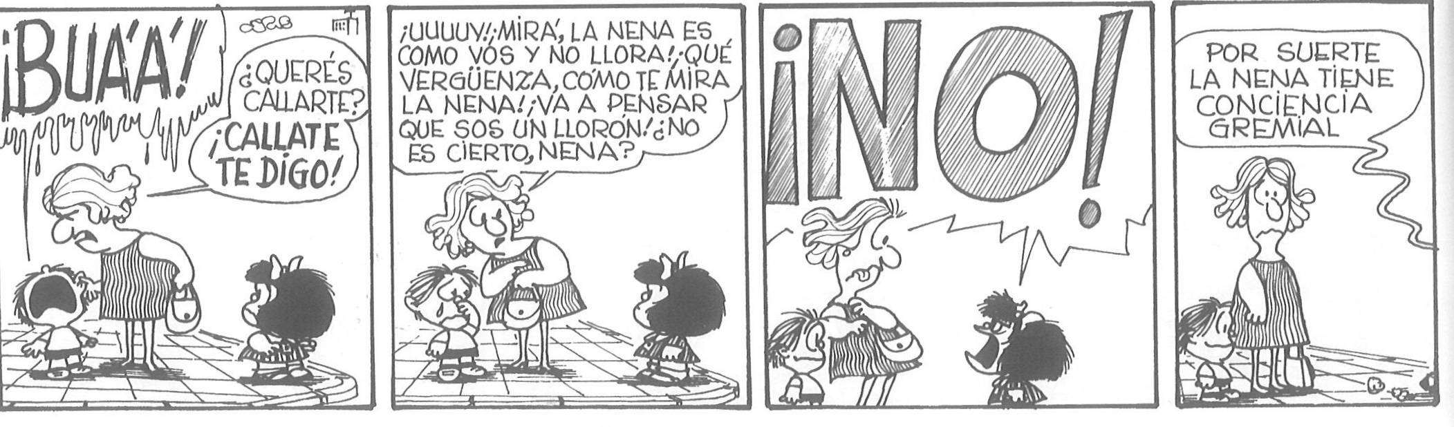 Del mismo modo, aún cuando es crítica con sus padres —a él no consigue respetarlo por lo que considera su inmadurez y falta de ambición, de su mamá le revienta que no se haya realizado individualmente mediante el estudio superior, que le permitiese desarrollar una carrera—, los sabe buena gente y mejor intencionados. Ni Mafalda ni Guille hubiesen llegado a ser como son en un hogar jodido, disciplinario, autoritario o dedicado a la humillación de los más pequeños, al estilo de los Macri y de los Milei. Lo que sí les reclama la nena es su falta de compromiso político, que es lo que tantos desaparecidos le reclamaban a sus mayores y de algún modo pretendieron sobrecompensar. En una tira encara a su madre, quien elude su responsabilidad pretendiendo que entender de política le dificultaría hacer bien las tareas de la casa. ¿Resultado de la discusión? Se le quema la comida y hay que gastar extra en una pizza. Otra de las cosas que advertí durante mi relectura actual de Mafalda: nunca antes había percibido cuán apretados estaban sus viejos en materia de presupuesto, clase media siempre al filo del ataque de nervios.)