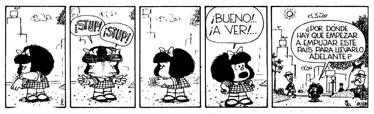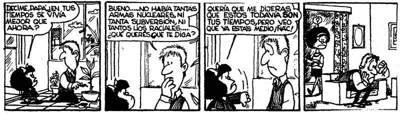 Entre las cosas que no cambiaron están las presiones a que se somete a los países latinoamericanos. En una tira Mafalda se niega a obedecer a su madre, porque está jugando a ser Presidenta y, dice, los Presidentes no obedecen a nadie. Pero su madre le retruca: «¡Y yo soy el Banco Mundial, el Club de París y el Fondo Monetario Internacional!» Esa tira podría haber sido escrita mañana. De esa realidad se desprende una segunda, también vigente. En otra tira la mamá regresa indignada de hacer las compras, profiriendo frases que en estos tiempos recuperaron actualidad: «¡Es una barbaridad, un escándalo! ¡Con estos precios, no hay dinero que alcance! ¡Yo no sé dónde vamos a parar!» Mafalda se burla de ella, porque está diciendo cosas que ya por entonces eran un cliché, un lugar común. Como su madre toma a mal la chanza y le revolea una verdura por la cabeza, Mafalda concluye: «La inflación vuelve susceptible a la gente». Y, sí. Esa es una de las razones por las cuales hoy estamos, entre otros estados de ánimo, susceptibles. A todos nos vendrían bien unas gotas o grageas de ese Nervo Calm que parecía esencial a la dinámica de la familia de Mafalda.