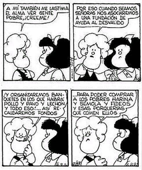 Tampoco cambió la realidad de la pobreza. La miseria está ahí, en las calles, en las villas miseria que Mafalda descubre al volver de sus vacaciones en el tren, en la viejita homeless que se refugia de la lluvia en un umbral. Y ella no sólo la registra: la padece. Para Mafalda es algo intolerable, la prueba de que el sistema en que vivimos es defectuoso. «Me parte el alma ver gente pobre», dice, «habría que dar(les) techo, trabajo, protección y bienestar». (Susanita, en cambio, se conformaría con esconderlos. La rubia es un perfecto exponente del gorilismo, seguro que el 22 vota a Pato. Cuando lee una pintada que dice «El pueblo al poder», estalla de este modo: «¿Para qué? ¿Para que después quede todo el poder lleno de cáscaras de naranja, papeles usados y manchas de sandwiches de chorizo?» La única diferencia es que hoy diría «manchas de choripán». Si no se casó con un García Moritán, Susanita, le pego en el poste.)