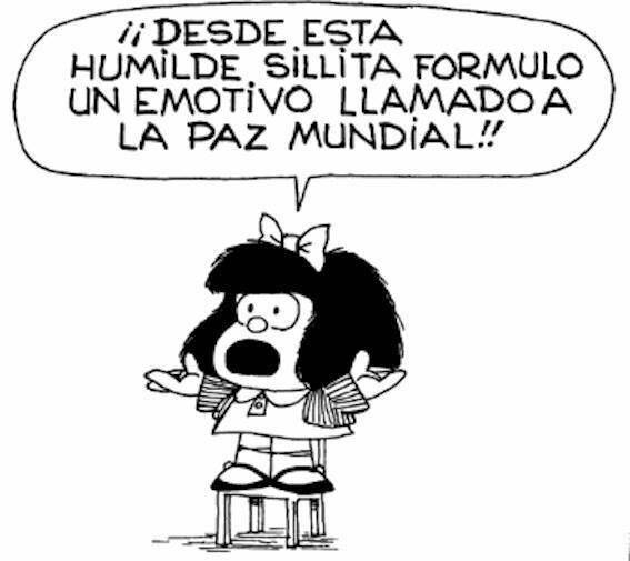 La nena abogó siempre por la paz, exigía el desarme mundial y la proscripción de las bombas nucleares, se soñaba intérprete en las Naciones Unidas para poner paños fríos a las declaraciones de países adversarios. Para Mafalda era normal jugar a que era Presidenta, aunque recelase de la capacidad de su género para conservar un chisme. (Imagino que hoy esa tira puede ser considerada machista, pero no olvido que la creación de Quino defendió sostenidamente el derecho de las mujeres a salir del corset de la familia tradicional. No en vano la protagonista es una cría — la tira se llama Mafalda, no Felipe.) Por eso es razonable decir que, de estar viva hoy, Mafalda no condonaría el reinado de las dos cosas que aborrecía aún más que la sopa: el capitalismo rampante y la violencia, caras complementarias de la misma moneda.