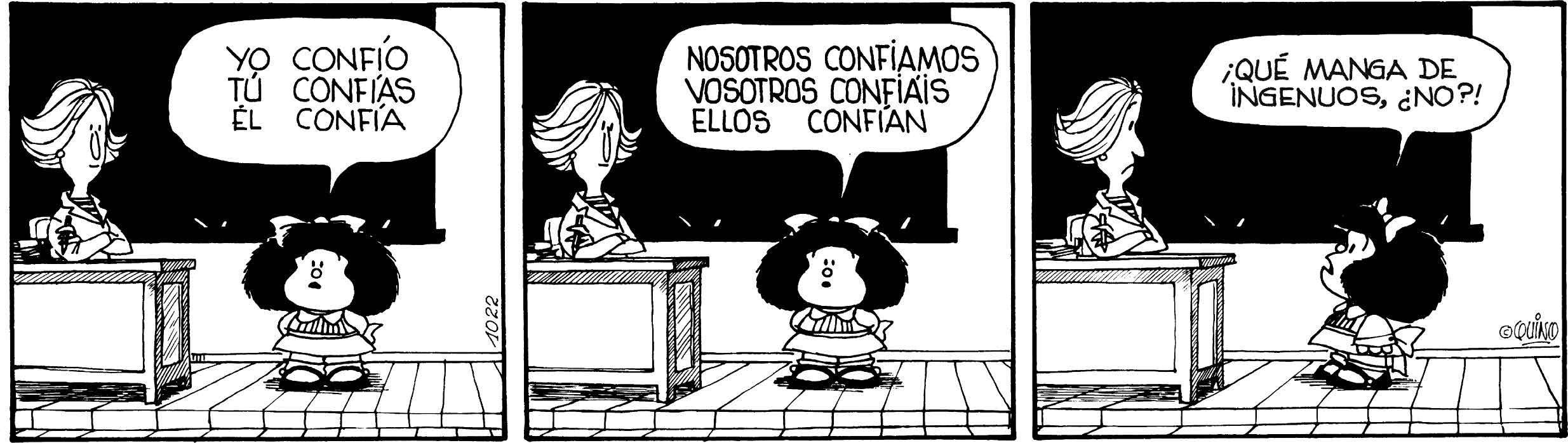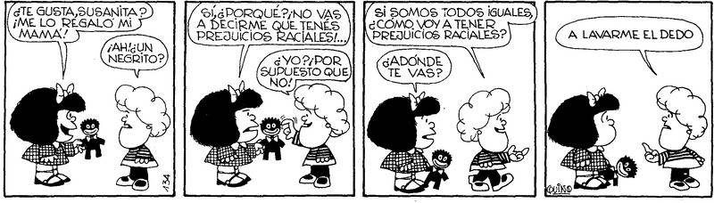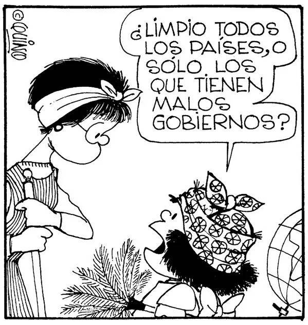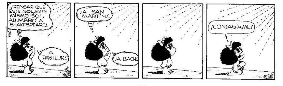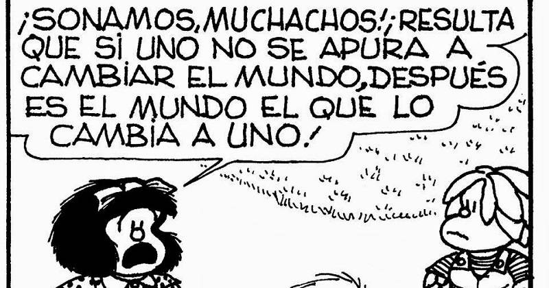 Porque, como dice otra tira, tanto jóvenes como adultos coincidimos en que «sería lindo levantarse un día y encontrarse con que por fin la vida de uno depende de uno». Porque también sería bueno que algún día pusiésemos fin a la diferencia que existe entre la definición de democracia que consta en el diccionario («Gobierno en que el pueblo ejerce la soberanía») y el modelo que padecemos en la vida real. Porque a lo mejor un día alguien del CONICET le hace caso a Mafalda, se aviva y desarrolla una vacuna contra la mala sangre, que tan bien nos vendría. Y porque llevamos demasiado tiempo entonando esa canción de protesta que Mafalda entona en una tira, delante de un micrófono improvisado con una lata y un escobillón, y cuya estrofa decía: