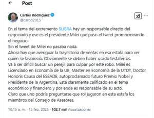Tanto el ex asesor de Milei, Carlos Rodríguez, como el economista español Eduardo Garzón calificaron sin rodeos la estafa y el involucramiento presidencial.