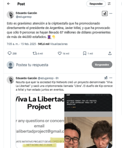 El especialista en sistemas e investigador de fraudes piramidales Maximiliano Firtman explicó el detalle el procedimiento. Evaluó el monto de la estafa de entre 70 y 100 millones de dólares, a 40.000 billeteras cripto que confiaron en el apoyo que publicó Milei en X e Instagram. La coincidencia entre la web del proyecto y la publicación presidencial marca una clara organización con día y hora, sin duda orquestada. El mensaje era: para apoyar a la Argentina hay que comprar esta cripto, cuya dirección incluyó en su posteo. Como muchos percibían que se trataba de una estafa, circuló que la cuenta de Milei había sido hackeada. Crear una criptomoneda no lleva más de 200 dólares y 15 minutos, pero nadie la compraría sin un respaldo tan fuerte como el presidencial. Nadie sabía de este proyecto hasta la publicación del Presidente. La empresa detrás del proyecto es Kip Network, registrada en Panamá. Sus fundadores tenían el 70% del circulante de la moneda, cuando lo usual es el 10-15%. Al lanzamiento valía US$ 0,000001, pero gracias a la publicidad de Milei llegó a US$ 5,20. Milei dejó fija durante horas su publicación como destacada, y de inmediato hubo bots y cuentas que empezaron a comprar, como los grupíes que ofertan para subir el precio en un remate. Cuando tiraron de la alfombra (en inglés a eso se le llama rug pull), la moneda cayó a cerca de cero. Según Firtman, será difícil investigar si el Presidente o amigos recibieron un porcentaje y unas pocas cuentas se llevaron la ganancia calculada entre 70 y 100 millones de dólares. Sin las publicaciones de Milei la estafa no podría haber ocurrido, porque nadie conocía la criptomoneda ni iba a invertir en ella.
