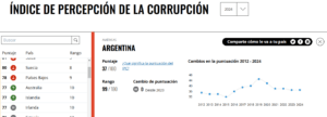 La mediciones de Transparencia Internacional de los últimos diez años contradicen las imágenes instaladas por gobiernos y medios argentinos. Tal como muestra este gráfico, bajó durante la presidencia de CFK, creció hasta sus más altos valores bajo el gobierno de Macrì, volvió a descender cuando trasladaron sus rencillas al Poliderportivo de Olivos el Doctor Fernández y su esposa, y se mantuvo sin cambios en el primer año de los Hermanos Milei.