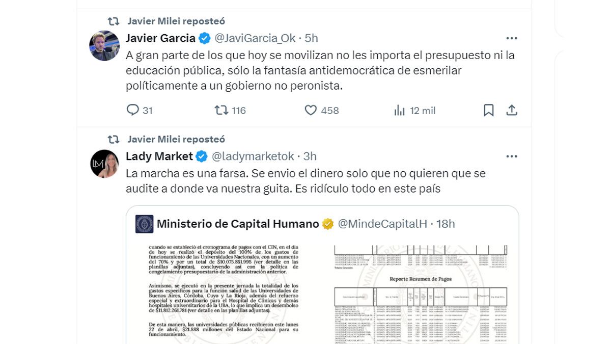 La hiperactividad de Javier Milei en redes sociales no es nueva, pero la catarata de retuits de mensajes criticando la marcha no parece denotar falta de preocupación en el Gobierno, si no, más bien, una gran preocupación.