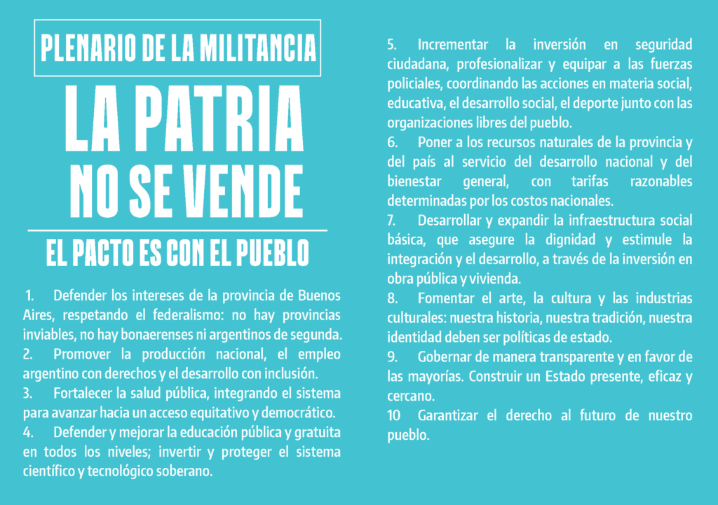 Con el plenario de la militancia de ayer, Kicillof intenta capitalizar el descontento contra el gobierno. Allí se aprobó un documento de 10 puntos, titulado El Pacto es con el Pueblo.