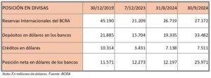 Si bien no hay un informe de la AFIP, al 30 de septiembre de 2024, las cuentas especiales que se deben abrir a tal fin en los bancos y en las ALyC (Agente de Liquidación y Compensación Integral) [3] fueron importantes. Y, en el caso de los bancos, en el balance mensual del BCRA de septiembre de 2024 se informa que el incremento de los depósitos en dólares en ese mes fue de 14.147 millones; gran parte se debe al blanqueo, y fueron fracciones menores a depósitos por compras de dólar MEP (dólar “bolsa”) y por imposiciones en cuenta corriente, caja de ahorro y plazo fijo en divisas.