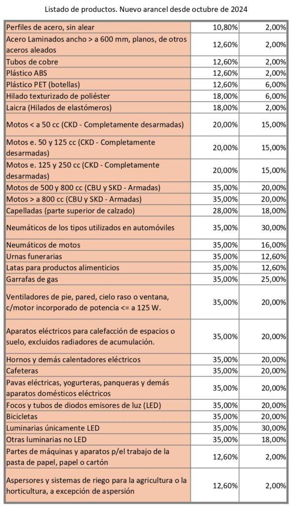 Paralelamente, el Ministerio de Economía informa en la página oficial que “el gobierno continúa reduciendo aranceles”. El gobierno nacional desde el 1 de octubre de 2024 reduce aranceles de importación de neumáticos para autos y motos, plásticos, pequeños electrodomésticos y productos de uso doméstico con el objetivo de alentar la competencia y beneficiar a la industria y a los consumidores. Y publica un extenso listado resumido en el siguiente cuadro.