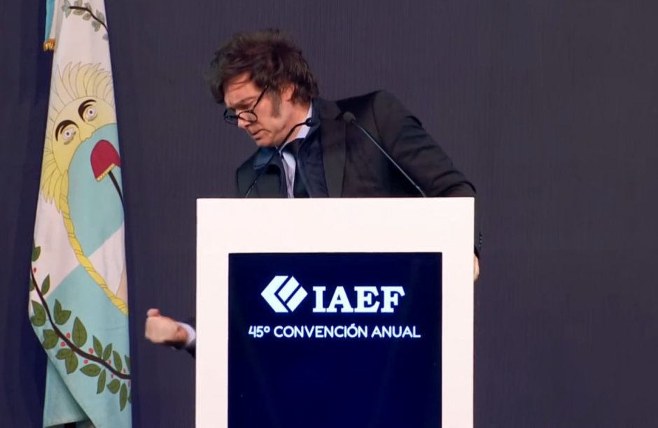 El presidente se mostró molesto en la convención de la IAEF. «Hay un negocio creciendo de vaselina para economistas pifiadores seriales», dijo en su clase magistral.