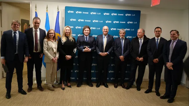 Milei llegó a la sede del BID junto a la secretaria General de la Presidencia, Karina Milei; el ministro de Economía, Luis Caputo; el canciller Gerardo Werthein, y el vocero Manuel Adorni. Al momento de pronunciar su mensaje, el asesor Santiago Caputo viajaba rumbo a Estados Unidos para sumarse a la delegación.