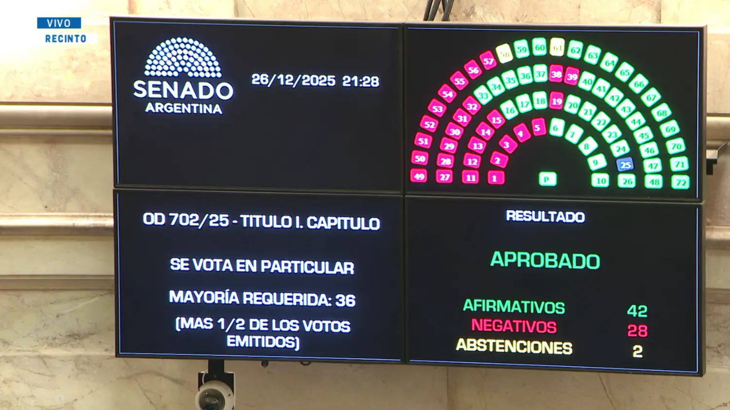 El gobierno de Javier Milei cierra el 2025 con un importante triunfo en el Senado: consiguió su primer Presupuesto 2026 y tras la sanción definitiva del proyecto, pasará la motosierra por áreas sensibles como Educación, Ciencia y Defensa. Tras la aprobación en general, se puso en debate el polémico Capítulo II -que contenía los artículos 12 y 30, dos puntos sensibles para la oposición-. Con 42 votos a favor, siendo 36 la mayoría requerida, también fue aprobado.