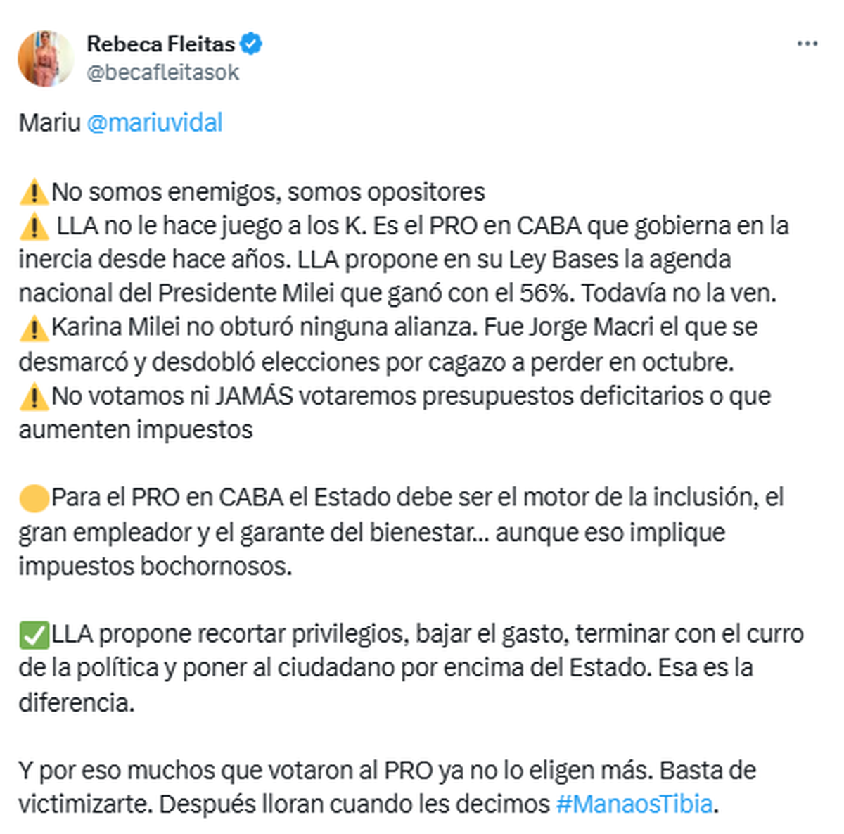 Tras las declaraciones de María Eugenia Vidal, los libertarios salieron a defender a Karina Milei y le pusieron los puntos a la diputada macrista. Fue a través de la legisladora porteña Rebeca Fleitas, quien en su cuenta de X enumeró: